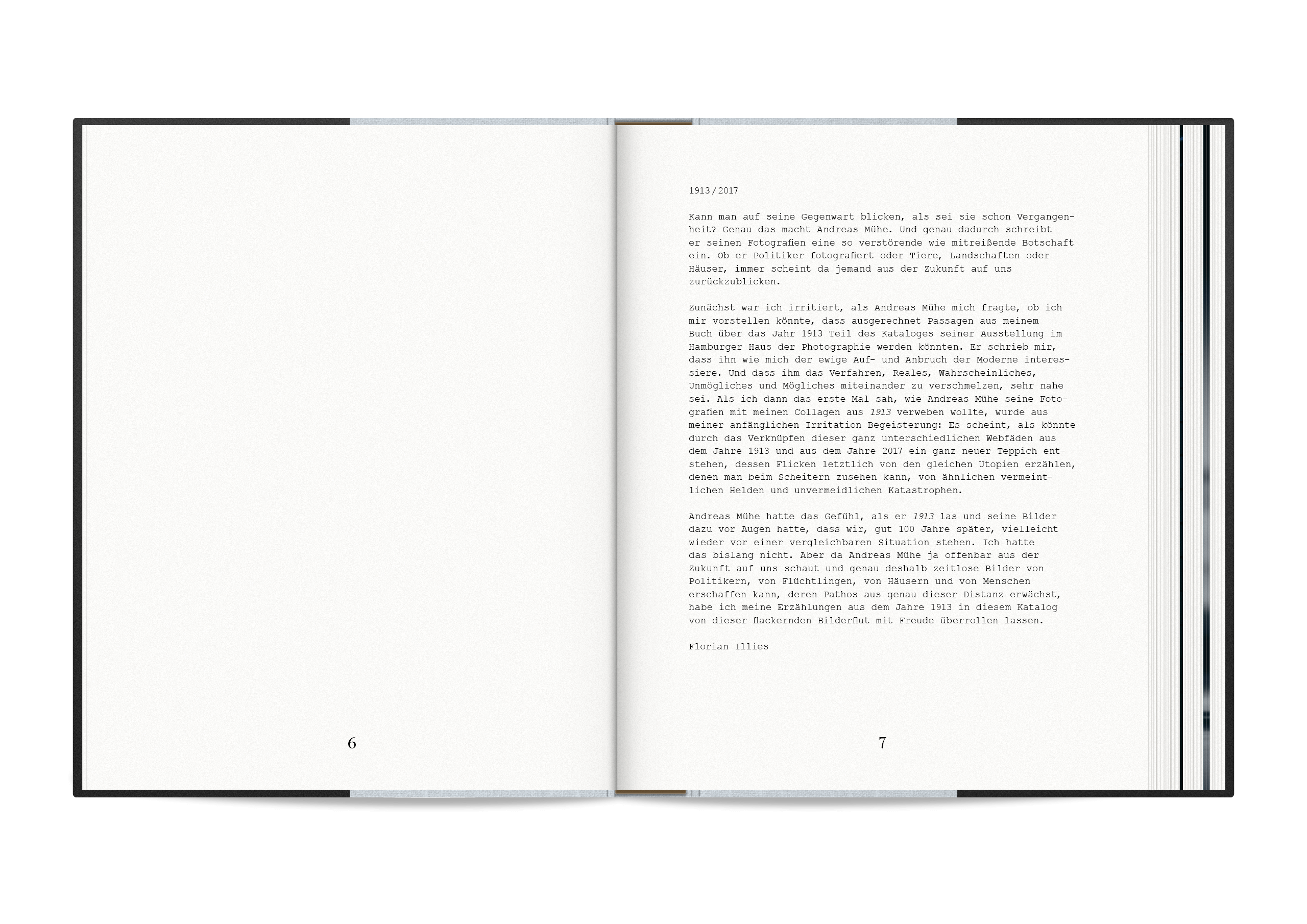 Andreas Mühe kommt aus einem theatralischen Haushalt und hat auch ein Stückchen auf der Mauer getanzt, als sie fiel. Diesem Umbruch verdankt er es mit Gegensätzen groß geworden zu sein, in Widersprüchen zu denken und einen Hauch von Dialektik anstelle der fehlenden Muttermilch aufgesogen zu haben. Darin sieht er den Ursprung seines Vermögens, immer wieder die Perspektive zu wechseln und Pathos in Distanz zu verwandeln. Die Fotografien von Andreas Mühe werden von Textauszügen des Romans „1913 − Der Sommer des Jahrhunderts“ von Florian Illies begleitet.