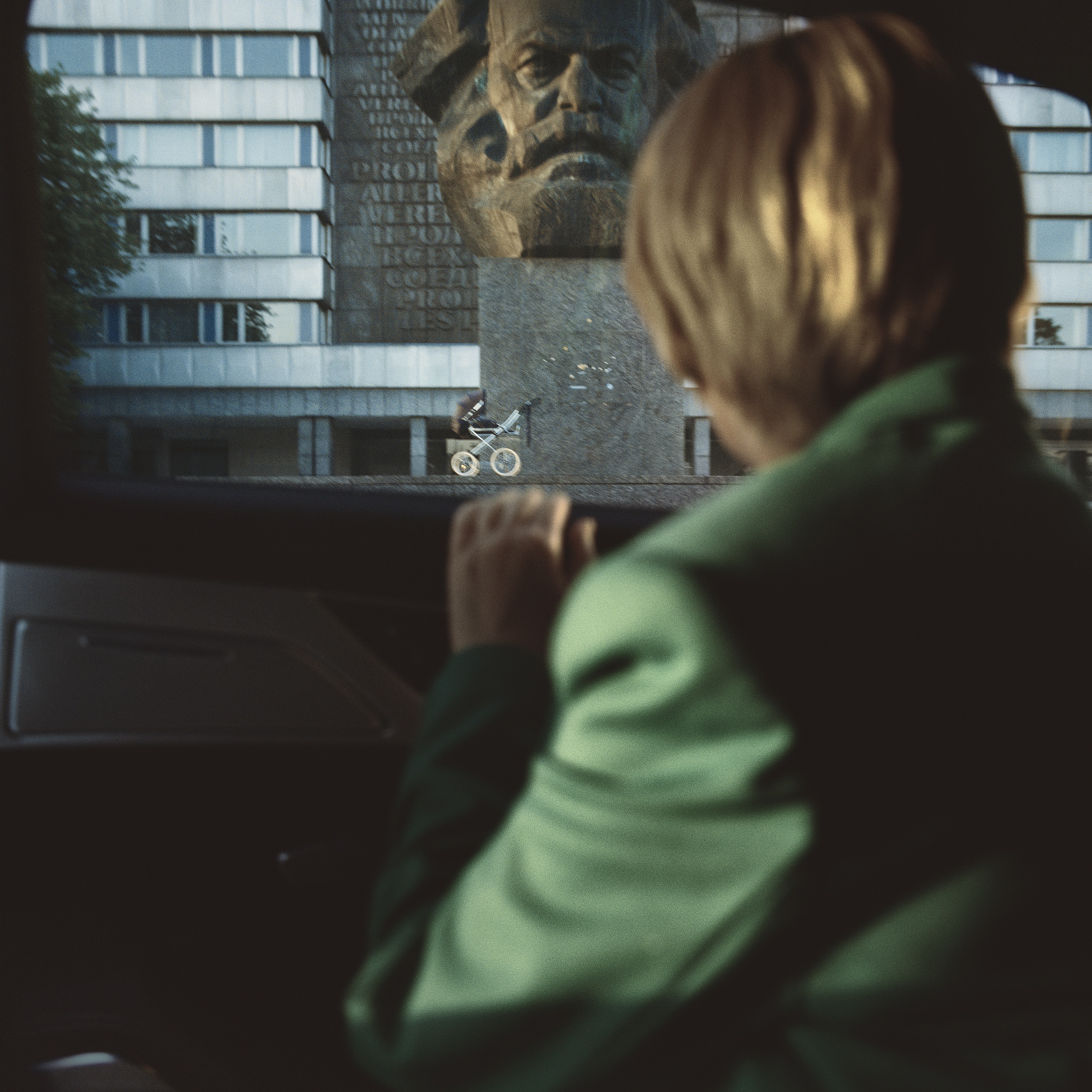 The small and large-scale pictures take up two exhibition rooms. The show’s central focus are the changing motifs of the traveling chancellor Angela Merkel, who admires “her” country from the backseat of her state limousine – the viewers follow her passing the chalk cliffs, along the river Oder and into the Uckermark.