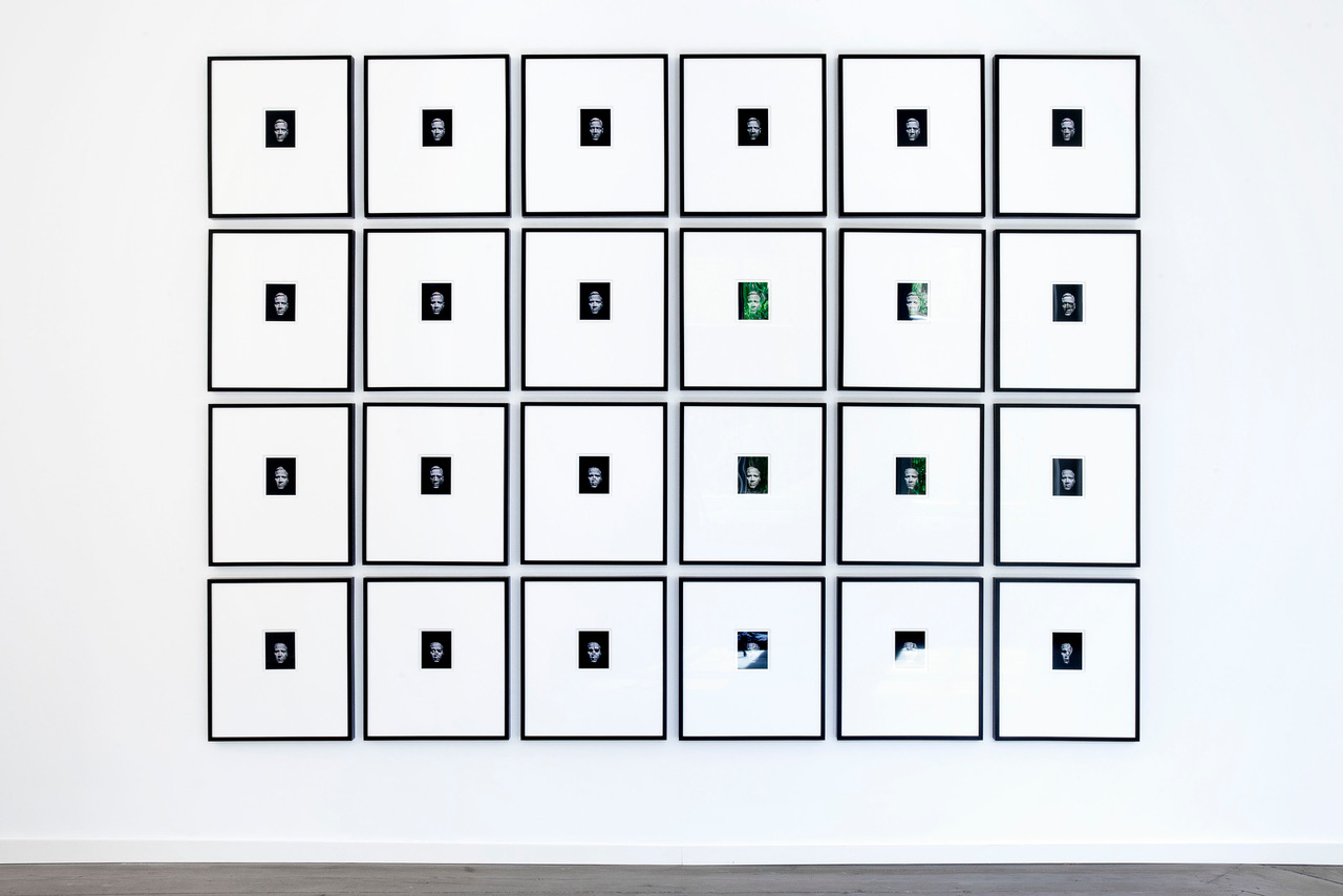 Andreas Mühe (1979, DE) unterwandert seine eigenen Bilder. Mit dem präzisen Einsatz von Licht, dem Herausarbeiten einer speziellen Farbigkeit und seinem Gespür für den Bildaufbau, der sich mit dem Spiel des Pathos beschäftigt, schafft er verführerisch-schöne Bilder. In der 24-teiligen Foto-Serie „Mühe-Köpfe“ zeigt er die verschiedenen Stadien des physischen Verfalls seiner eigenen in Stein geschlagenen Büste.