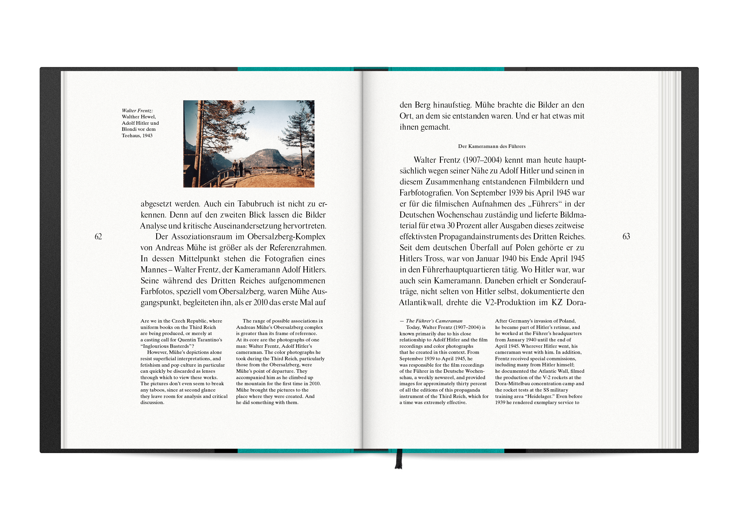 Andreas Mühe (geb. 1979 in Karl-Marx-Stadt, lebt und arbeitet in Berlin), einer der renommierten deutschen Fotografen, ist zu Hause angekommen: mitten in Deutschland, besser gesagt im kollektiven Gedächtnis einer Nation, die nicht aus dem dunklen Schatten ihrer Vergangenheit treten kann. Dort, wo es noch immer schmerzt und die Zeit nicht zu vergehen scheint, am sagenumwobenen Obersalzberg, ist Andreas Mühe mit seiner Kamera auf Spurensuche gegangen, um den Mythos Obersalzberg zu erfassen und die liebste Idylle des Nationalsozialismus neu zu sehen. Seine Archäologie der Erinnerung ist eine Reise in die Gegenwart unseres Bildgedächtnisses, das jene Jahre festgehalten und abgespeichert hat, ohne dass wir vor Augen hatten, was Mühes Bilder uns zeigen.