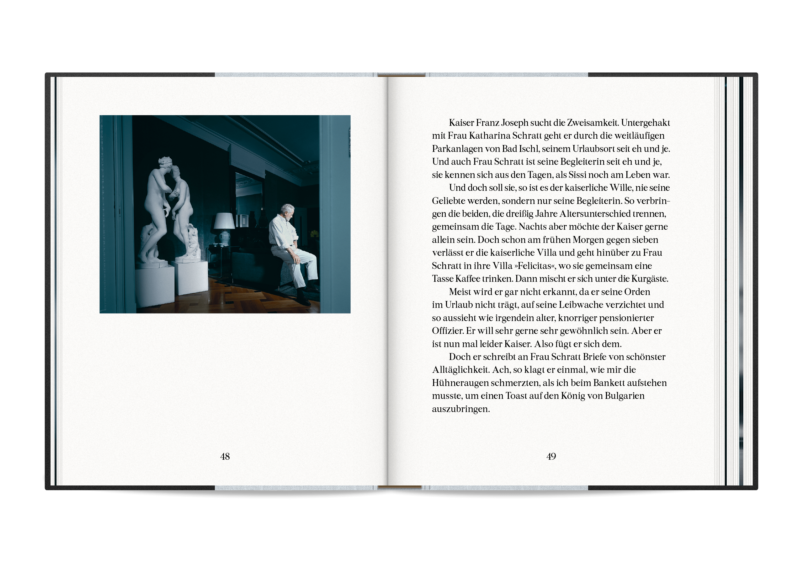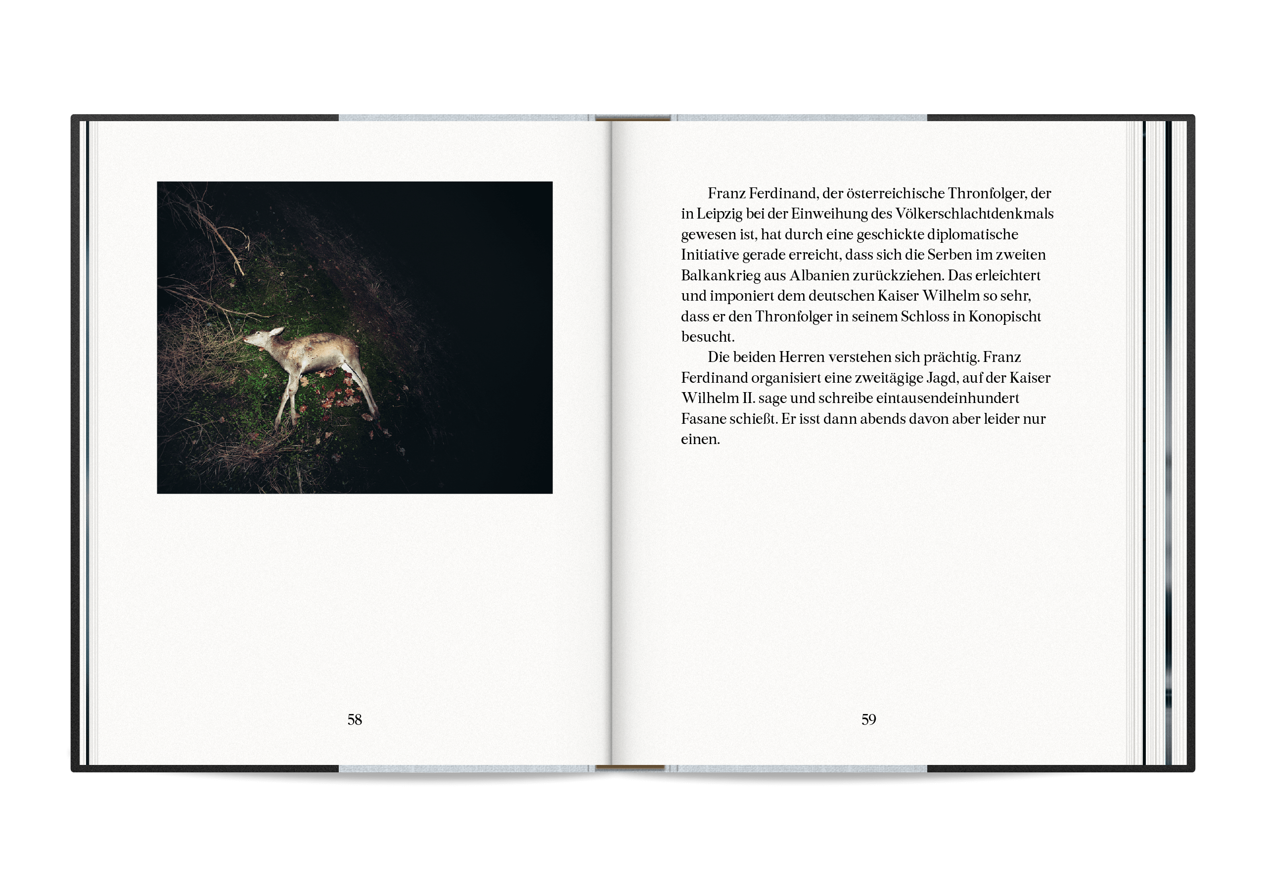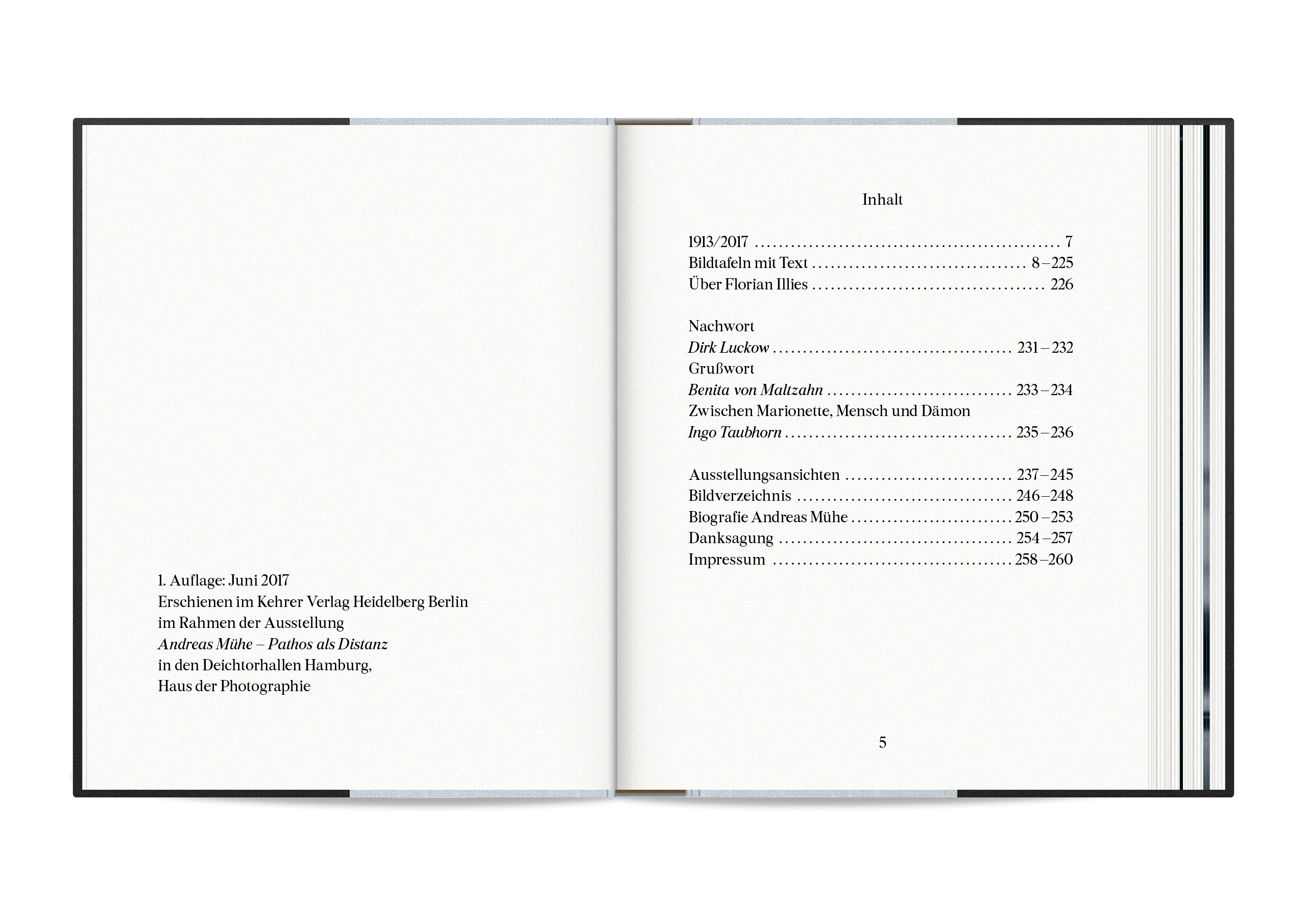 Andreas Mühe kommt aus einem theatralischen Haushalt und hat auch ein Stückchen auf der Mauer getanzt, als sie fiel. Diesem Umbruch verdankt er es mit Gegensätzen groß geworden zu sein, in Widersprüchen zu denken und einen Hauch von Dialektik anstelle der fehlenden Muttermilch aufgesogen zu haben. Darin sieht er den Ursprung seines Vermögens, immer wieder die Perspektive zu wechseln und Pathos in Distanz zu verwandeln. Die Fotografien von Andreas Mühe werden von Textauszügen des Romans „1913 − Der Sommer des Jahrhunderts“ von Florian Illies begleitet.